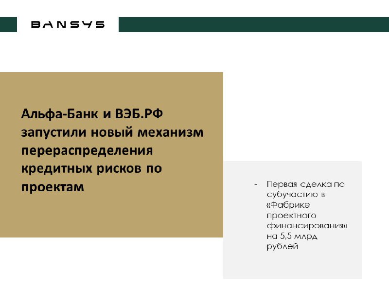Альфа-Банк и ВЭБ.РФ подписали одно из первых соглашений о субучастии в синдицированном кредите, выданном в рамках программы «Фабрика проектного финансирования». Сумма сделки — около 5,5 млрд рублей с возможностью увеличения, срок — до 10 лет. Альфа-Банк выступил внешним приобретателем кредитного риска.